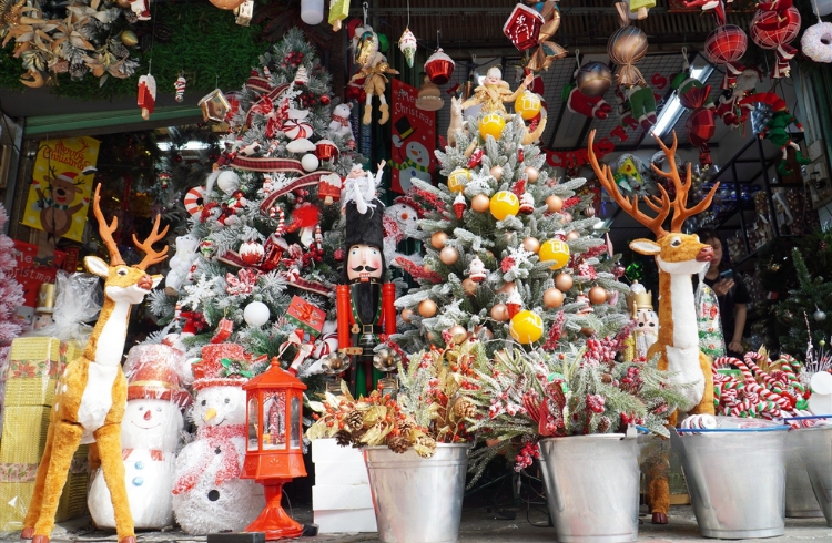 Nhắc đến địa điểm chơi Noel Sài Gòn, phố Hải Thượng Lãn Ông luôn là cái tên được nhắc đến đầu tiên. Cứ vào khoảng đầu tháng 11, cả con phố dài hơn một cây số này lại “thay áo mới” với hàng trăm gian hàng rực rỡ sắc màu. Từ cây thông Noel, dây kim tuyến, đèn led, quả châu, tượng ông già Noel cho đến mô hình hang đá, tất cả đều được bày bán sôi động khắp hai bên đường. Đây chính là thiên đường mua sắm đồ trang trí Noel lớn nhất Sài Gòn, thu hút hàng nghìn lượt người ghé thăm mỗi tối để dạo chơi, chụp ảnh và lựa quà Giáng sinh.