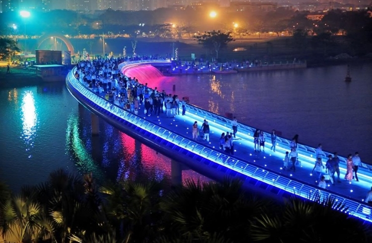 Nếu bạn muốn tìm một địa điểm chơi Noel Sài Gòn nhẹ nhàng, lãng mạn và thoáng đãng, Hồ Bán Nguyệt tại Phú Mỹ Hưng sẽ là sự lựa chọn hoàn hảo. Từ đầu tháng 12, khu vực này được trang trí bằng hàng ngàn bóng đèn nhiều màu sắc trải dọc theo Cầu Ánh Sao, các đài phun nước, vườn cây và tuyến đường Cảnh Đồi (Midtown). Không gian lung linh phản chiếu xuống mặt hồ phẳng lặng tạo nên khung cảnh đẹp đến mê mẩn.