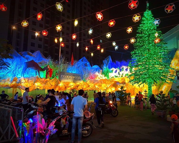 Nhắc đến những địa điểm đậm chất Giáng sinh nhất Sài Gòn, xóm đạo Phạm Thế Hiển luôn nằm trong top đầu. Đây là khu vực tập trung đông các gia đình Công giáo, vì vậy mỗi mùa Noel, cả con đường dài lại rực rỡ trong ánh đèn và những mô hình Giáng sinh được trang trí cực kỳ công phu. Những hang đá Thánh Gia, nhà gỗ, cây thông khổng lồ hay hộp quà phát sáng liên tục xuất hiện dọc hai bên đường, tạo nên khung cảnh huyền ảo như một “làng Giáng sinh thu nhỏ” ngay giữa lòng quận 8 cũ.
