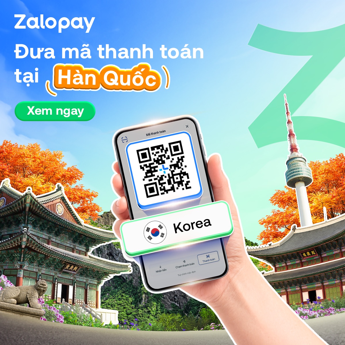 Từ những khu chợ đêm náo nhiệt tại Myeongdong đến các quán cafe mang đậm phong cách thẩm mỹ tại Seoul, Hàn Quốc luôn tràn đầy năng lượng sáng tạo. Để bắt kịp nhịp sống nhanh và hiện đại xứ Hàn, Zalopay cung cấp giải pháp thanh toán quốc tế mượt mà, giúp bạn tự tin mua sắm những bộ mỹ phẩm "hot trend" hay những bữa ăn ẩm thực đa dạng chỉ trong vài giây. Tỷ giá hối đoái minh bạch và tính năng bảo mật tối ưu sẽ giúp bạn yên tâm thanh toán mà không cần mang theo ví tiền dày cộm.
