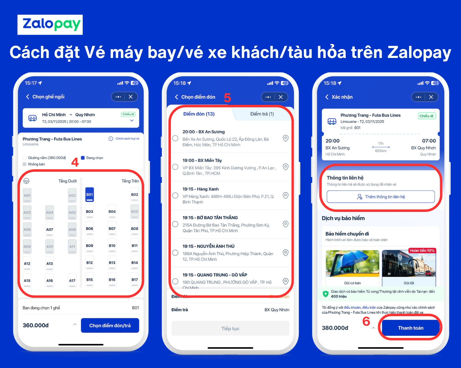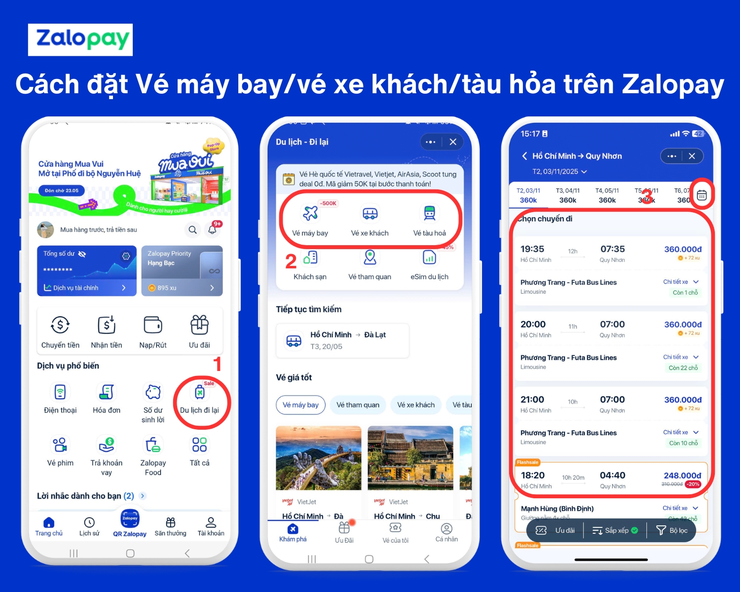 - Bước 6: Áp dụng voucher (nếu có) → Thanh toán bằng Zalopay → nhận e-ticket/mã đặt chỗ trong app & email.