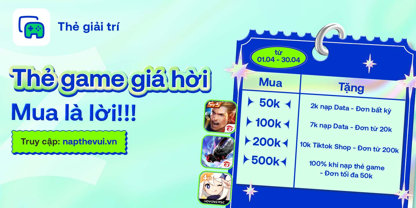 - Mua đơn 500.000đ giảm 100% khi nạp thẻ game bất kỳ (Đơn tối đa 50.000đ)