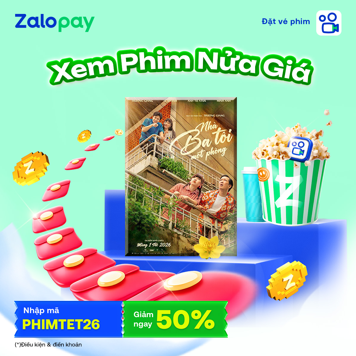 Bộ phim Nhà Ba Tôi Một Phòng đã chính thức mở bán vé trên ứng dụng Zalopay. Nhanh tay chọn chỗ ngồi thật đẹp để Tết này cùng gia đình ra rạp, tận hưởng trọn vẹn những khoảnh khắc cảm xúc trên màn ảnh lớn nhé.