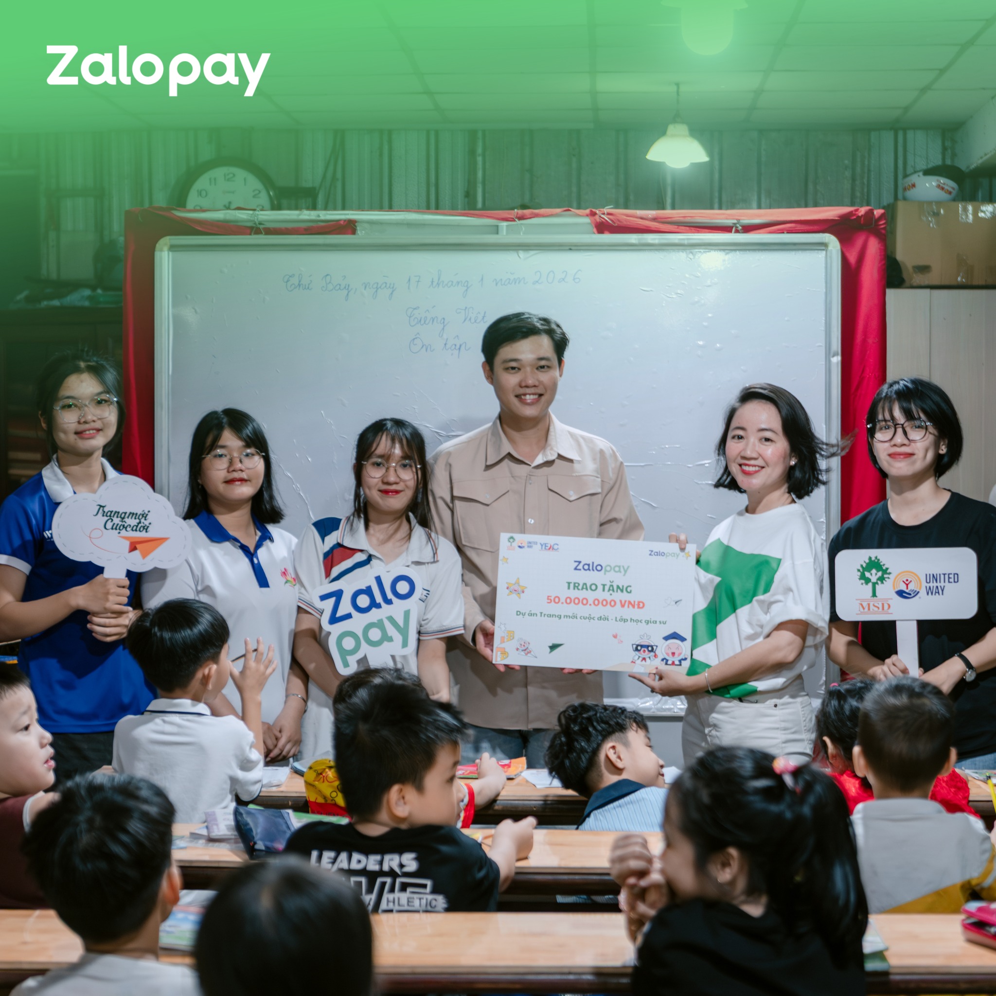 Và cột mốc ấy đã chính thức được ghi dấu! Ngày 17/01 vừa qua, Zalopay đã trao tặng 50 triệu đồng cho quỹ học bổng cho các em nhỏ tại lớp học gia sư tình thương Phú Thạnh. Khoản đóng góp này được hình thành từ hàng chục nghìn lượt thanh toán khoản thu học đường của phụ huynh.