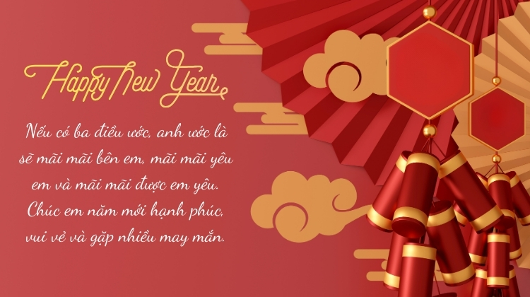 - Nếu có ba điều ước, anh ước là sẽ mãi mãi bên em, mãi mãi yêu em và mãi mãi được em yêu. Chúc em năm mới hạnh phúc, vui vẻ và gặp nhiều may mắn.