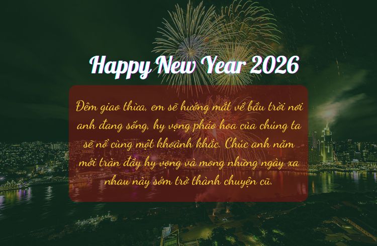 1. Tết đến rồi anh à… Em cứ nghĩ rằng bản thân mình quen với cảm giác yêu xa, nhưng mỗi khi pháo hoa sắp nổ, lòng em lại mềm đi vì không có anh bên cạnh. Chúc anh năm mới bình an và mong ngày sớm nhất em có thể ôm anh thật lâu để bù lại những tháng ngày xa cách.