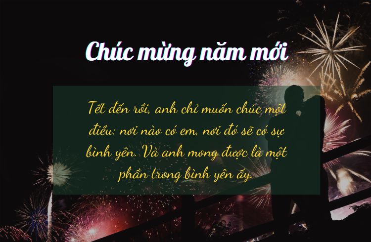 - Mỗi khi nghĩ về năm mới, điều đầu tiên anh nhớ đến chính là em. Em là bình yên của anh, là nơi anh muốn trở về sau tất cả. Chúc em năm mới ngọt ngào, ấm áp và tràn đầy những điều tốt đẹp, như cách em đã lấp đầy trái tim anh bằng yêu thương.